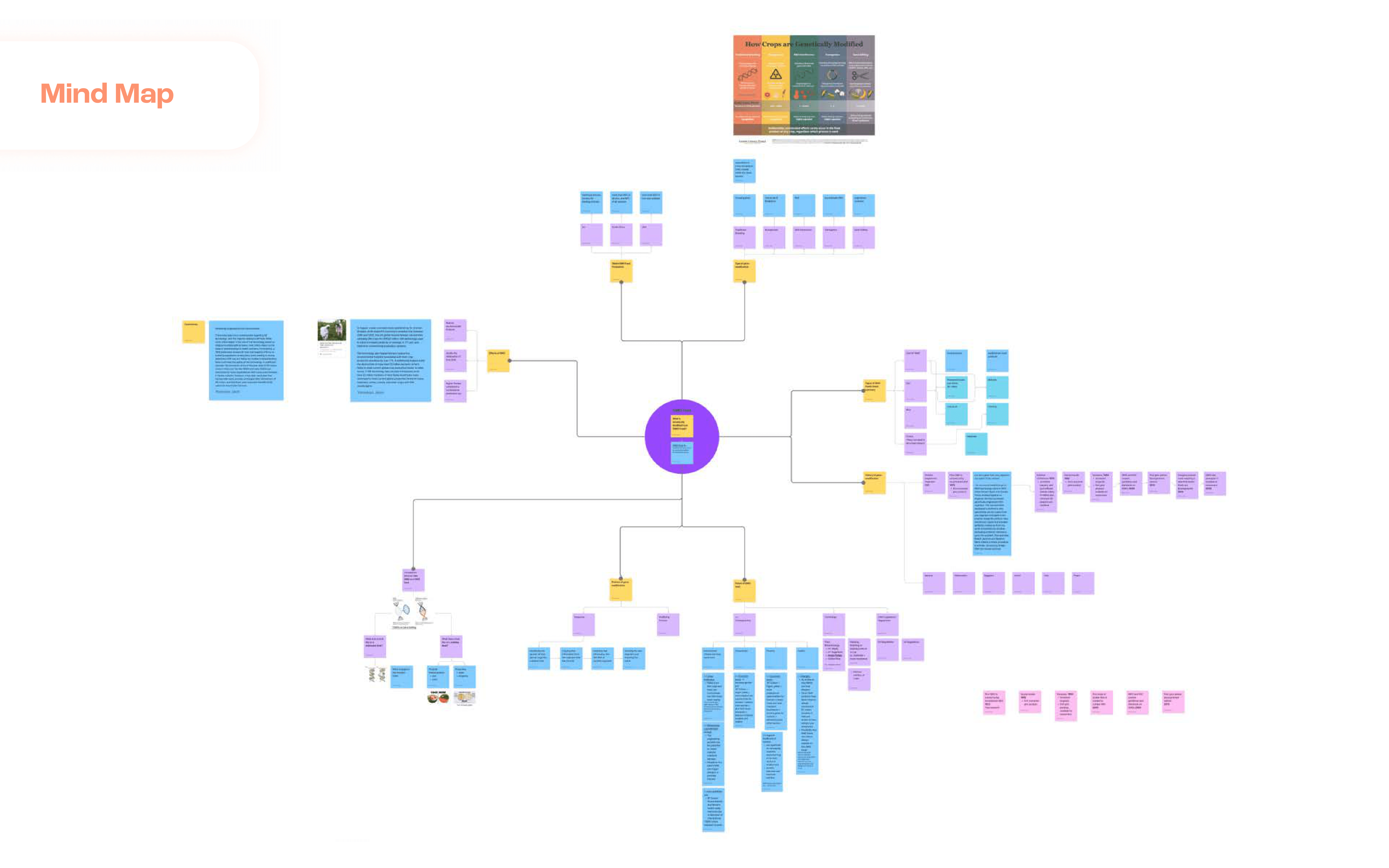 To answer these questions we started by creating a mind map to understand what areas of GMOs we need to delve into.
